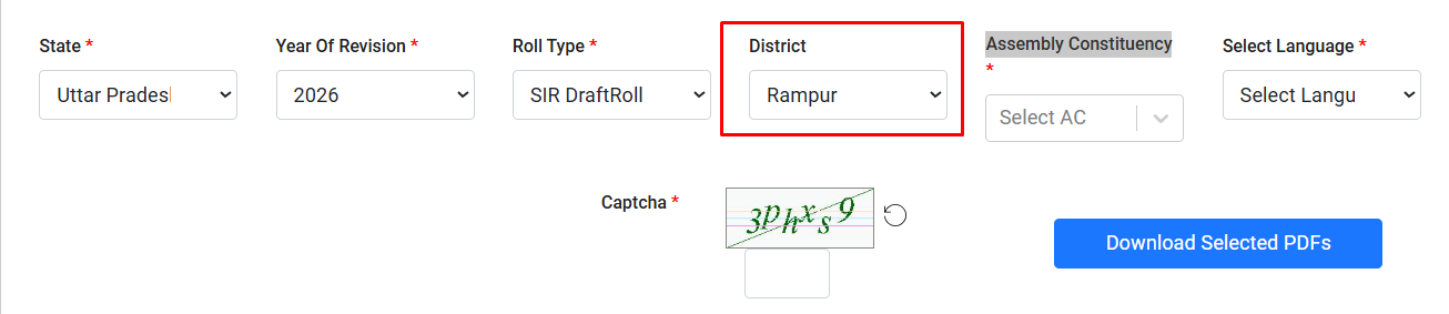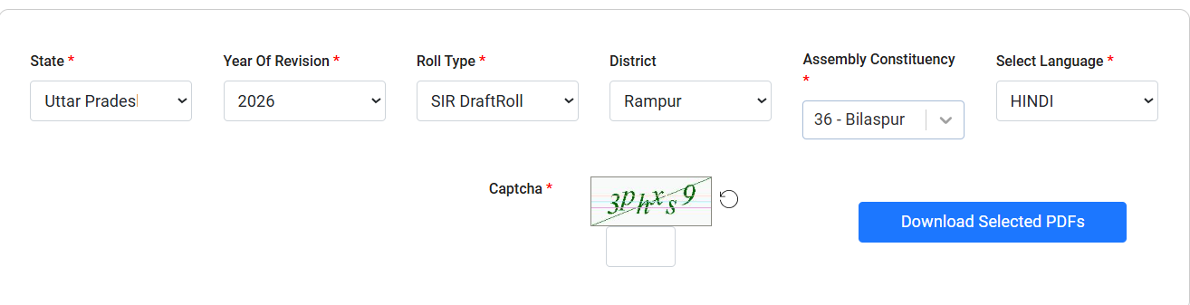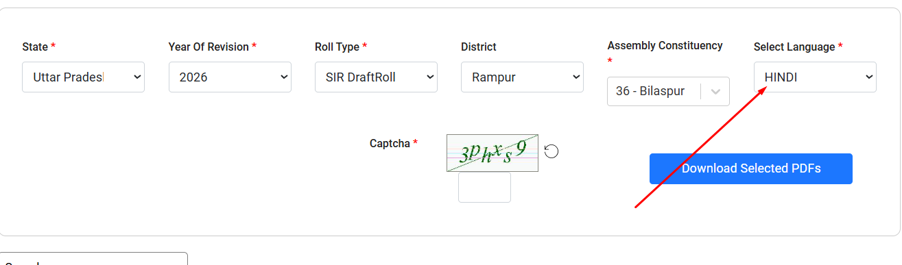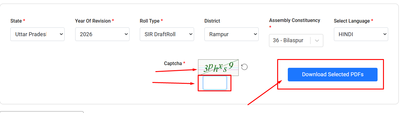पोलिंग स्टेशन सेलेक्ट करने के बाद आपको स्क्रॉल करके ऊपर आना है और अब आपको कैप्चा कोड देखकर सही से दर्ज करना है कॅप्टचा कोड दर्ज करने के बाद आपको Download Selected PDF बटन पर क्लिक करना हैं,