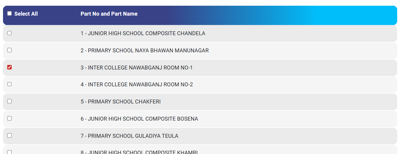 राज्य का नाम , जिले का नाम , और बाकी जानकारी को दर्ज करने के बाद आपको आपके शहर और गांव के सभी पोलिंग स्टेशन देखने को मिलेंगे अब आपको अपने पोलिंग स्टेशन का नाम देखना है और उसको टिक कर लेना हैं