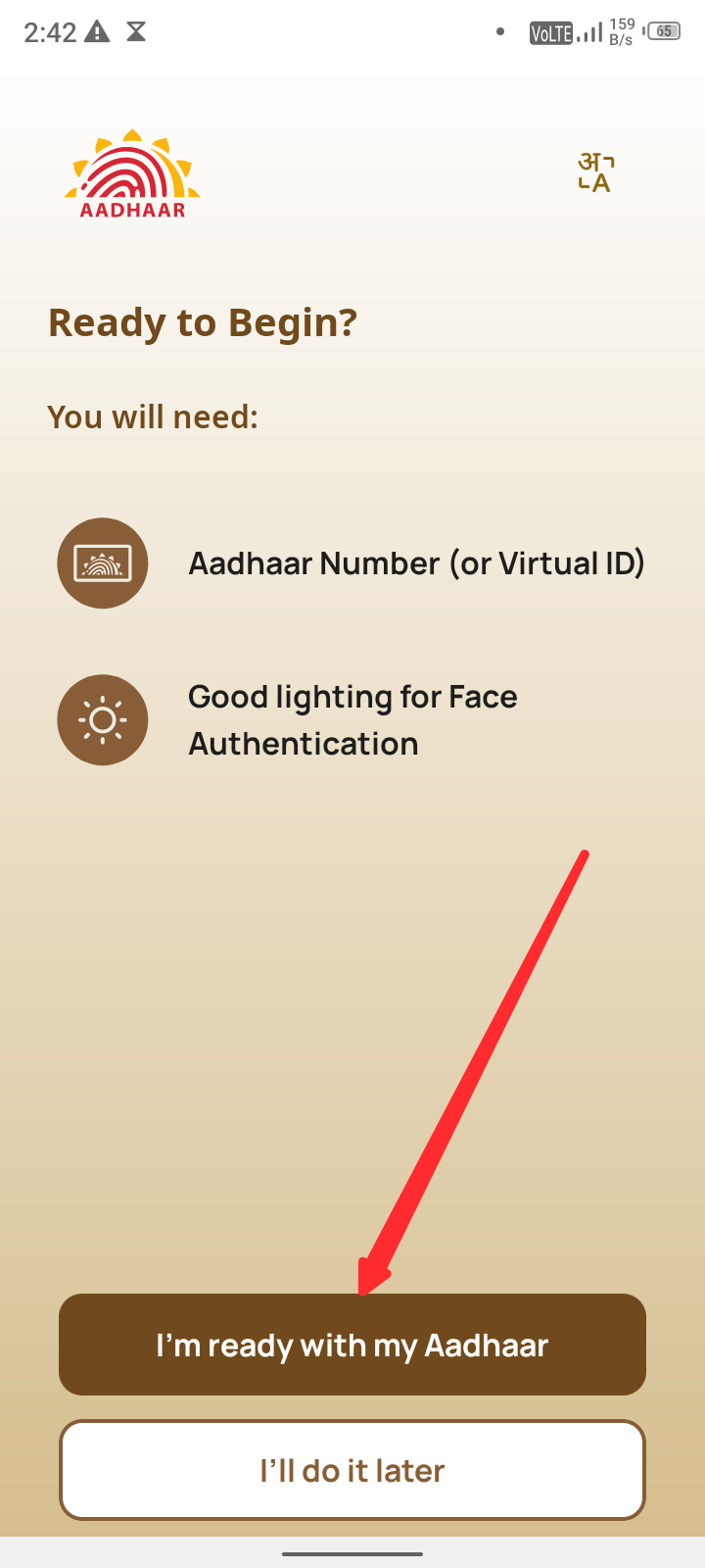 पहले आपको यहां पर बताया जाएगा कि आपको सही से आधार नंबर लिखना है तथा अपना चेहरा सही से दिखाना है और चेहरा साफ दिखना चाहिए लाइटिंग के साथ में इसको समझने के बाद आपको I am ready with my Aadhar पर क्लिक करें।