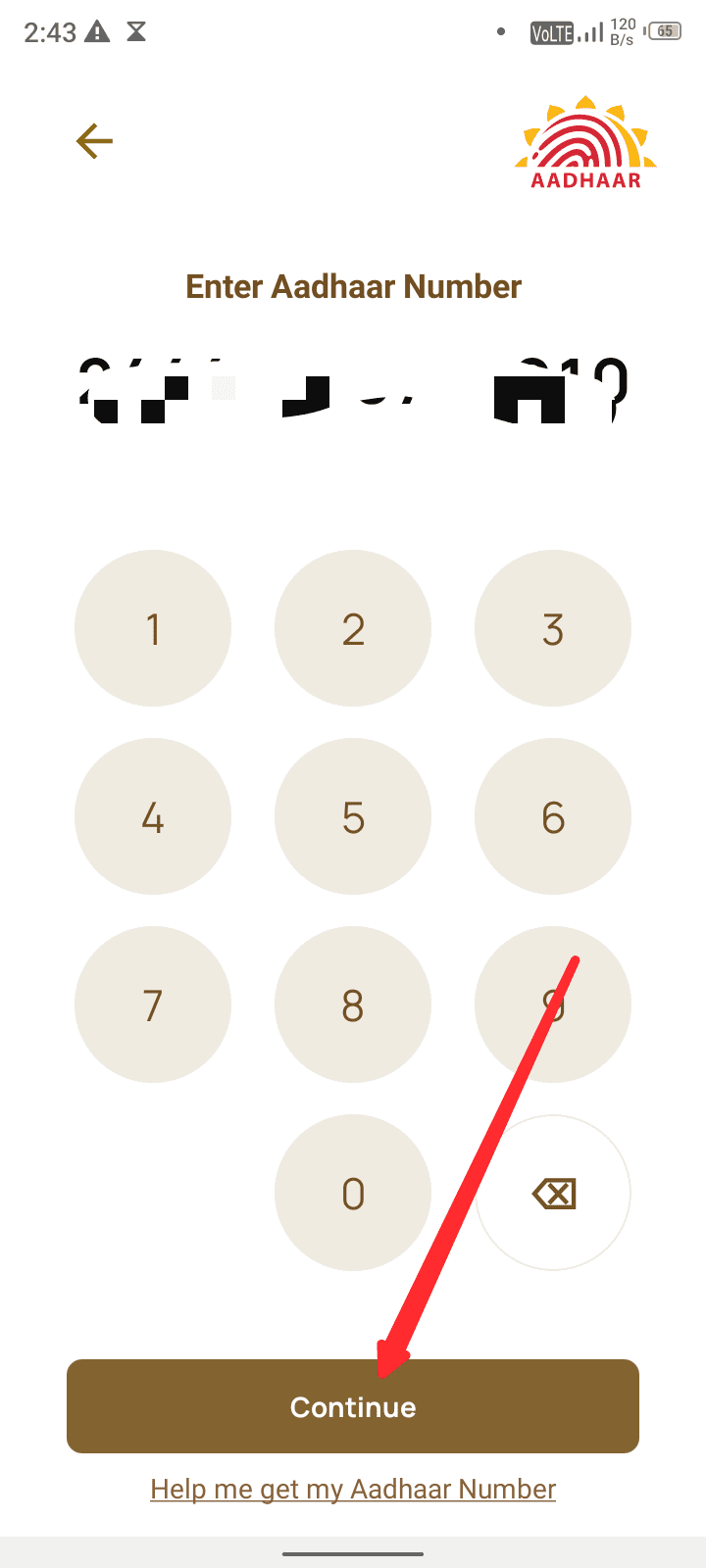 फिर आपको अपना आधार नंबर लिखना है आधार नंबर लिखने के बाद Continue बटन पर क्लिक कर दें।