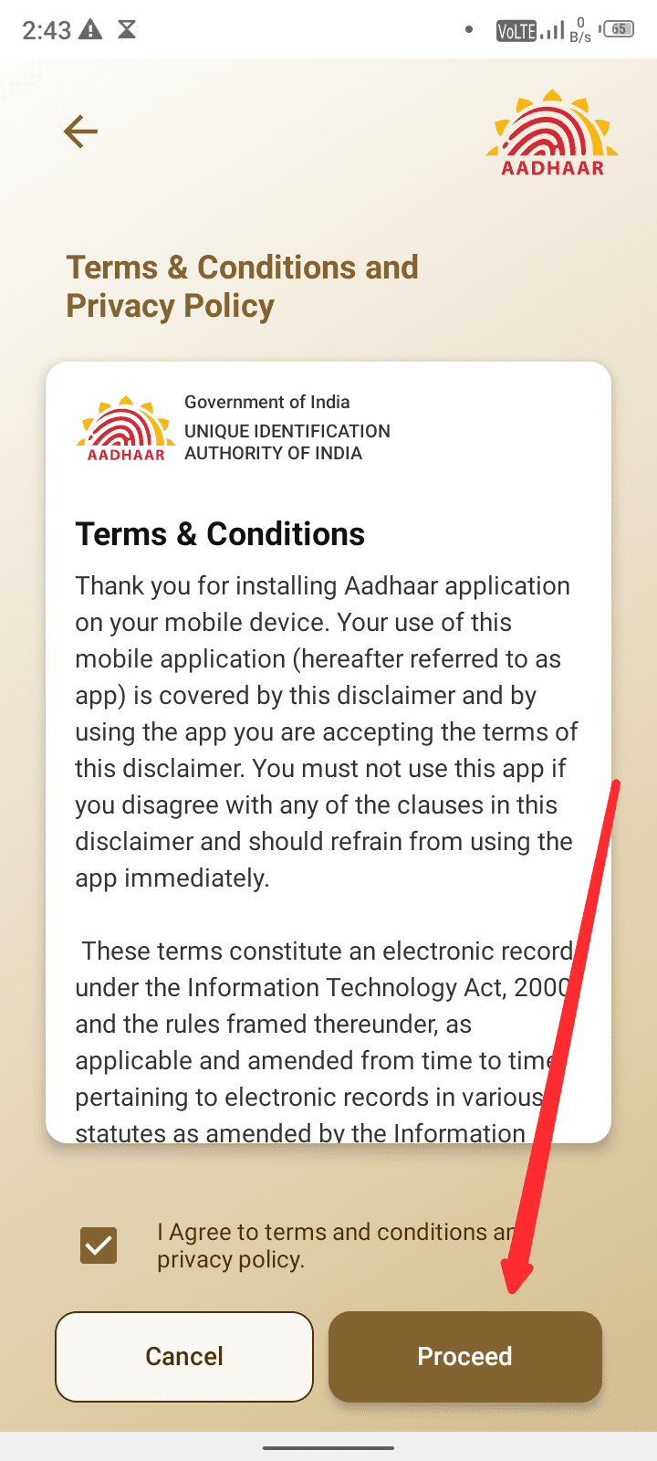 अब यह एप्लीकेशन आपको सभी terms and condition दिखाएगा आपको इसको पढ़ना है या छोड़ भी सकते हैं यहां पर आप I Agree Box Tick कर लें तथा Proceed बटन पर क्लिक कर दें।