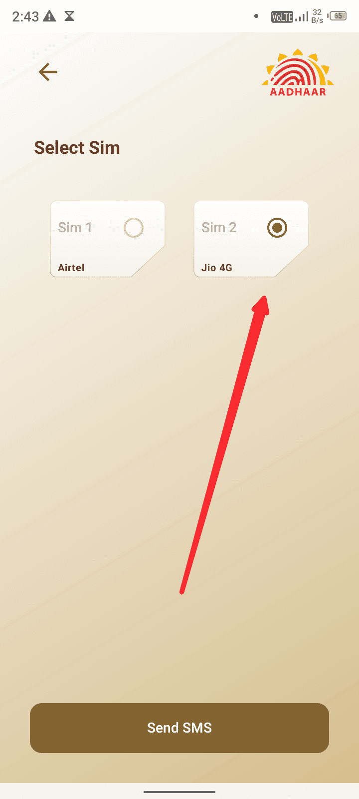 अब आपको अपने मोबाइल नंबर का वेरिफिकेशन करना होगा इसके लिए सबसे पहले आप उस नंबर का चयन करें जो आपके आधार कार्ड से लिंक है। Sim slot सिलेक्ट करने के बाद Send Sms पर क्लिक करें।