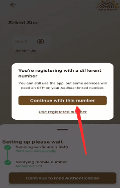 एक बार Confirm करने के लिए फिर से Continue With This Number पर क्लिक करें। उसके बाद automatically application आपके मोबाइल नंबर को Match करेगा, यदि आपके आधार कार्ड से मोबाइल नंबर Link है तो successfully verify हो जाएगा।