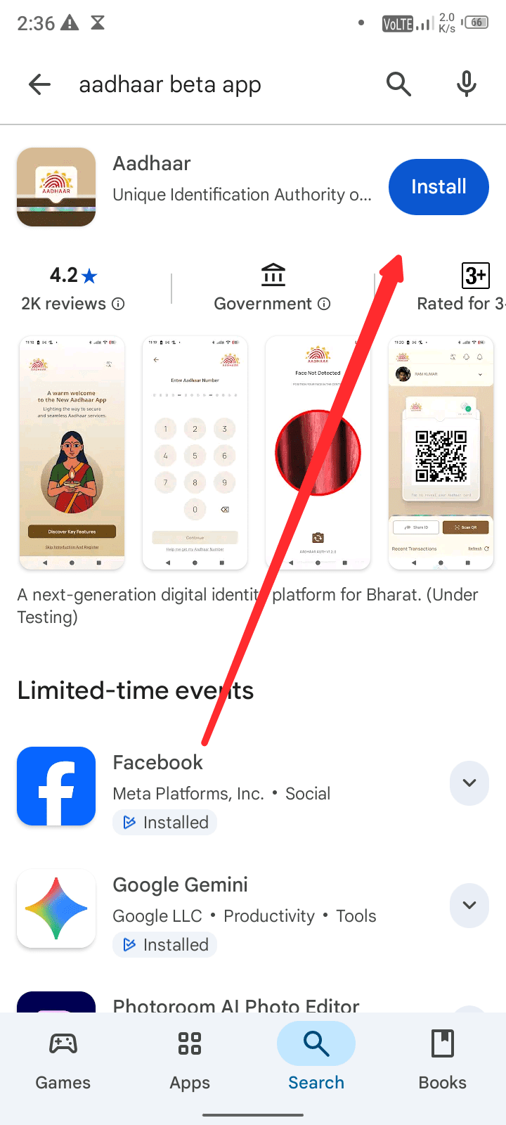 सबसे पहले आपको अपने मोबाइल के प्ले स्टोर में आना है यहां आने के बाद आपको सर्च करना है Aadhar Beta App यह दिखाने के बाद आधार कार्ड का एप्लीकेशन सर्च रिजल्ट में दिखाई देगा।