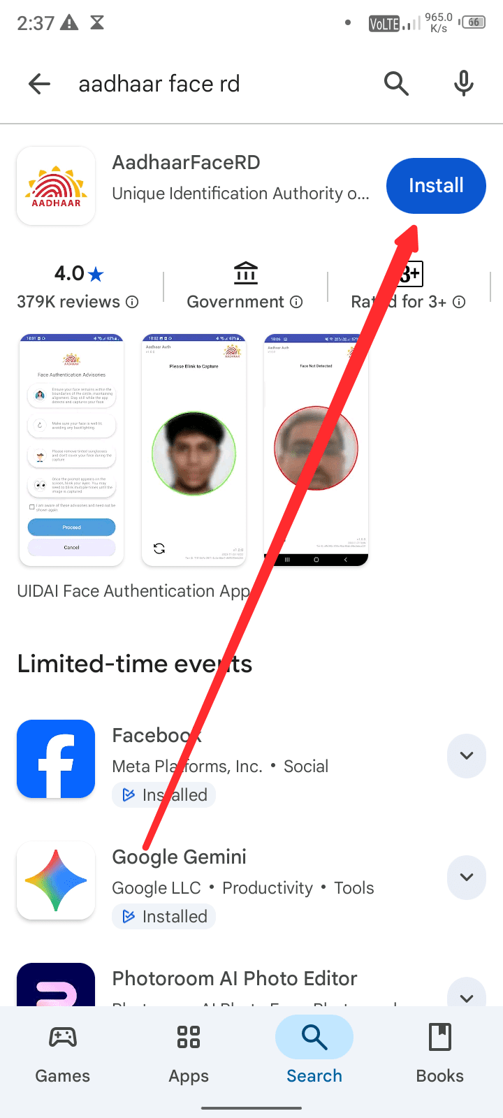 Adhaar Face Rd एप्लीकेशन लिखकर सर्च करने के बाद आपको यह एप्लीकेशन देखने के लिए मिलेगा इसको भी डाउनलोड करना है डाउनलोड करने के लिए आप Install बटन पर क्लिक करें यह एप्लीकेशन तुरंत डाउनलोड होने लग जाएगा अब आपका पहले आधार कार्ड वाला एप्लीकेशन डाउनलोड हो गया होगा उस एप्लीकेशन को खोलें,
