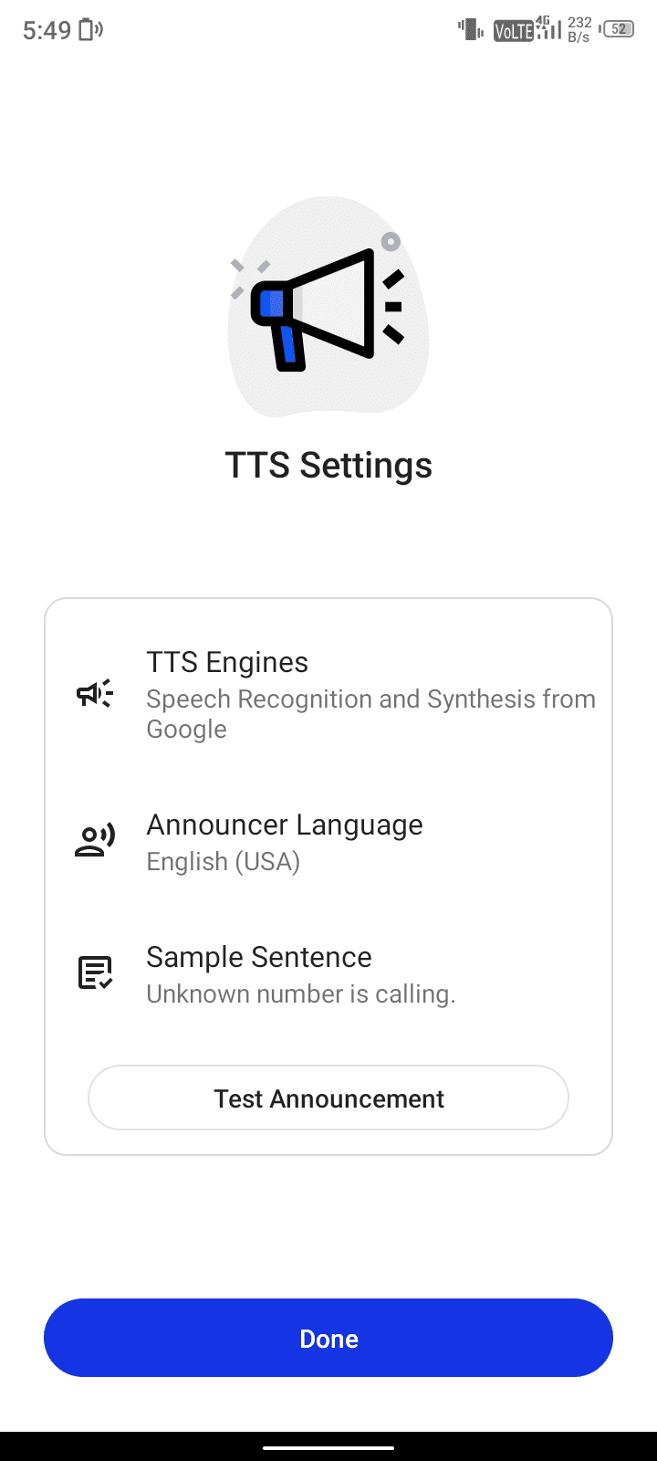 Permission allow करने के बाद TTS सेटिंग कंप्लीट हो जाएगी यहां पर आप Done पर क्लिक कर दें