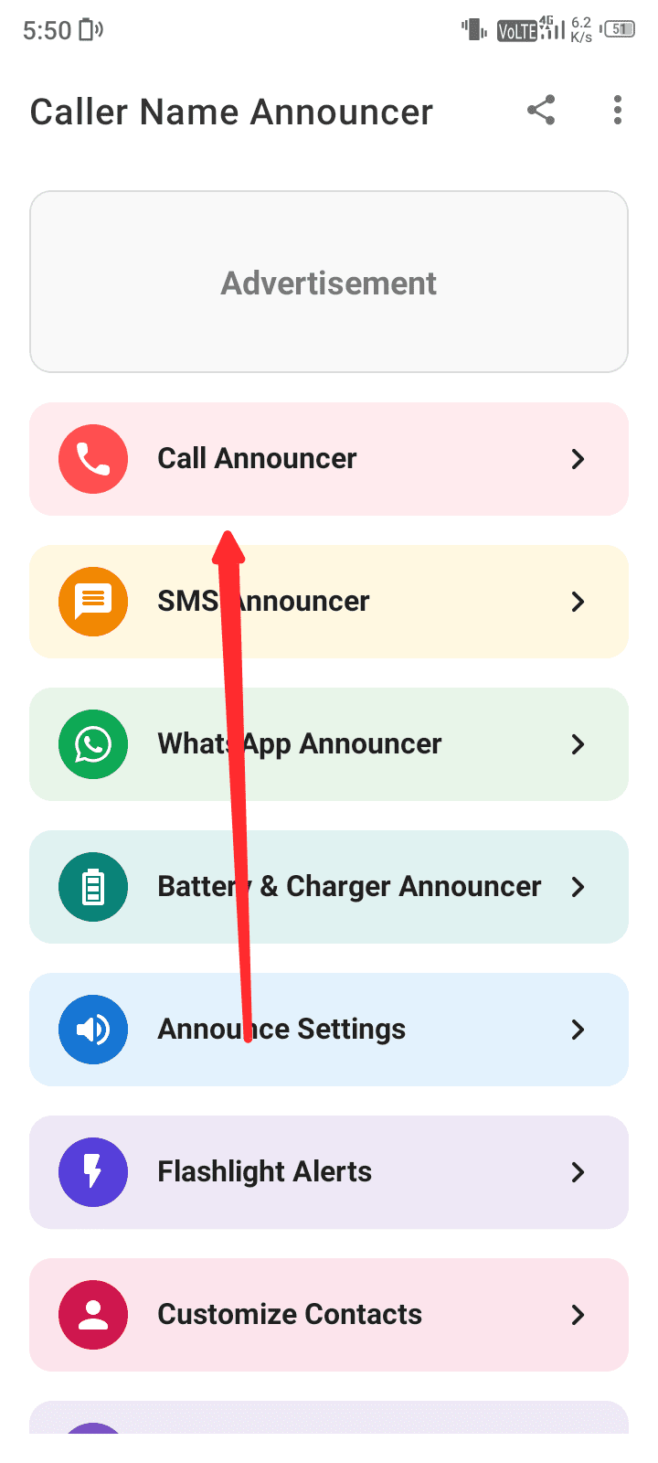एप्लीकेशन में आने पर बहुत सारे ऑप्शन यहां पर देखने के लिए आपको मिलेंगे सबसे ऊपर call announcer ऑप्शन सेलेक्ट करें