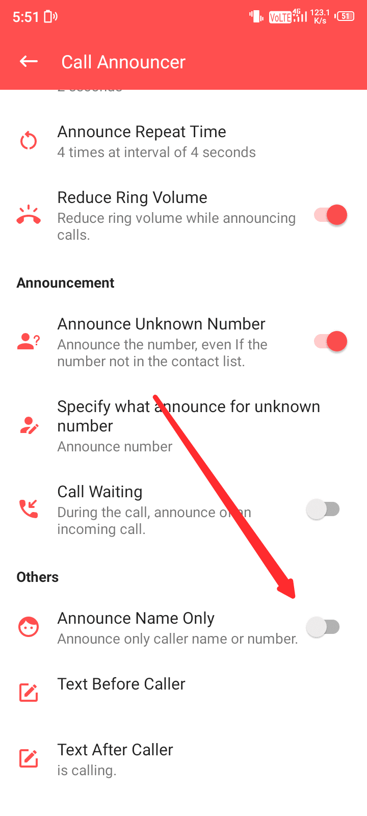 Call announcer पर क्लिक करने के बाद यहां पर पेज को स्क्रॉल करें नीचे आए और announce name only setting enable कर दें।