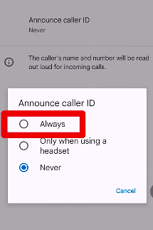 Announce caller ID पर क्लिक करने के बाद तीन ऑप्शन सेलेक्ट करने के लिए मिलेंगे यहां पर आप always option सिलेक्ट कर दें।