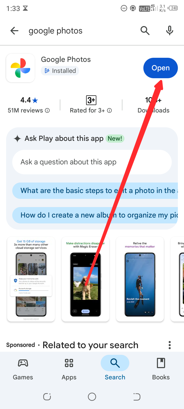 गूगल फोटोज एप्लीकेशन से स्टोरेज खाली करने के लिए सबसे पहले आपको मोबाइल में प्ले स्टोर एप्लीकेशन में जाना है प्ले स्टोर एप्लीकेशन में जाने के बाद आपको search पर क्लिक करके Google Photos एप्लीकेशन लिखकर सर्च करना है उसके बाद यदि एप्लीकेशन पहले से इंस्टॉल है तो अपडेट कर लेना है यदि इंस्टॉल नहीं है तो पहले इंस्टॉल करें और ओपन कर लें।