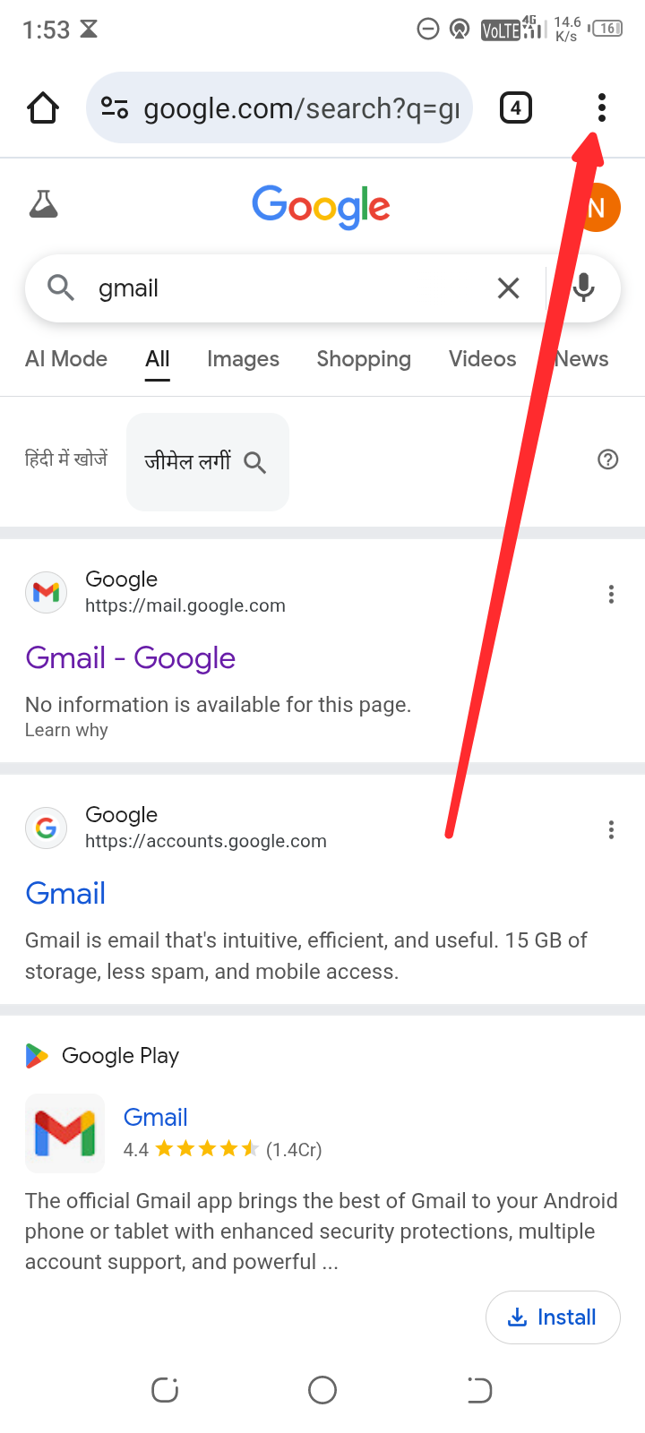 जीमेल लिखकर सर्च करने के बाद आपको 3 डॉट पर क्लिक करना है उसके बाद डेस्कटॉप साइट को सेलेक्ट कर लेना है।