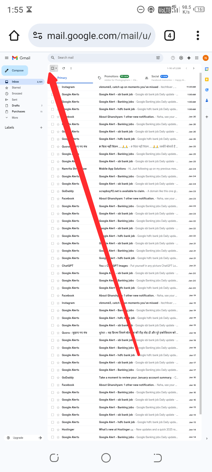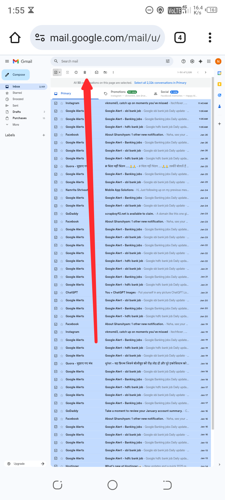 इतना करने के बाद आपके मोबाइल में जीमेल की स्टोरेज खाली हो जाएगी लेकिन अभी भी यदि स्टोरेज खाली नहीं हो रही है तब आप अपने ईमेल आईडी में सभी मैसेज को डिलीट करें एक-एक करके सभी ईमेल्स को डिलीट करेंगे तब बहुत अधिक समय लगेगा चलिए आपको एक बार में अधिक ईमेल्स को डिलीट करने का तरीका बताते हैं।