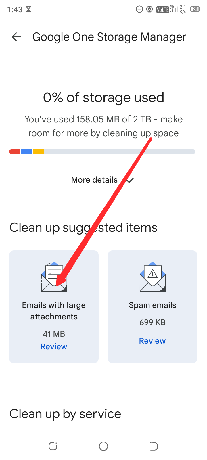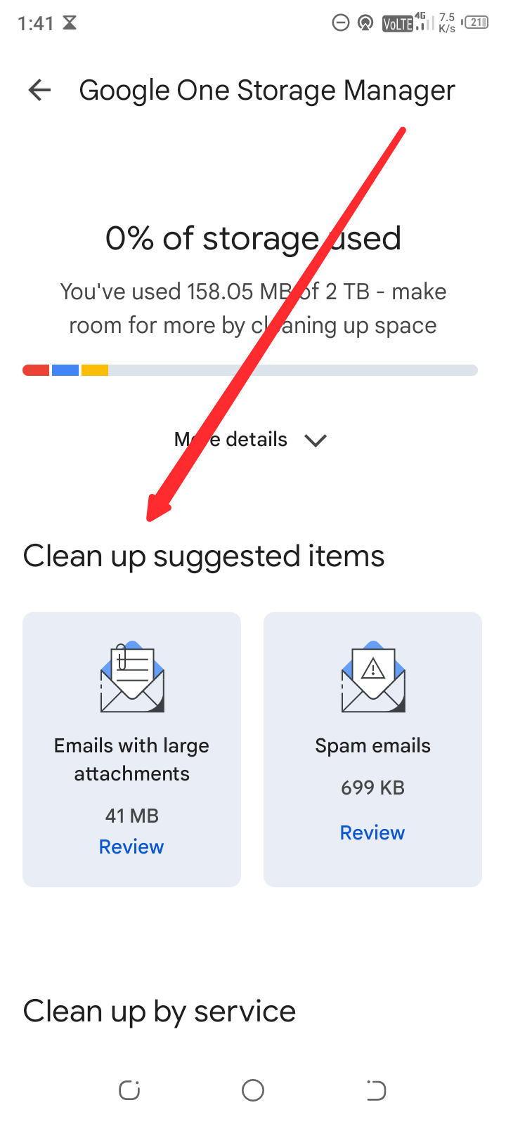 सभी फाइल्स को डिलीट करने के बाद दो स्टेप्स पीछे आना है यहां पर आपको clean up suggested items में Spam Email को Delete करना है, स्पैम ईमेल को डिलीट करने के लिए spams emails पर क्लिक करें।