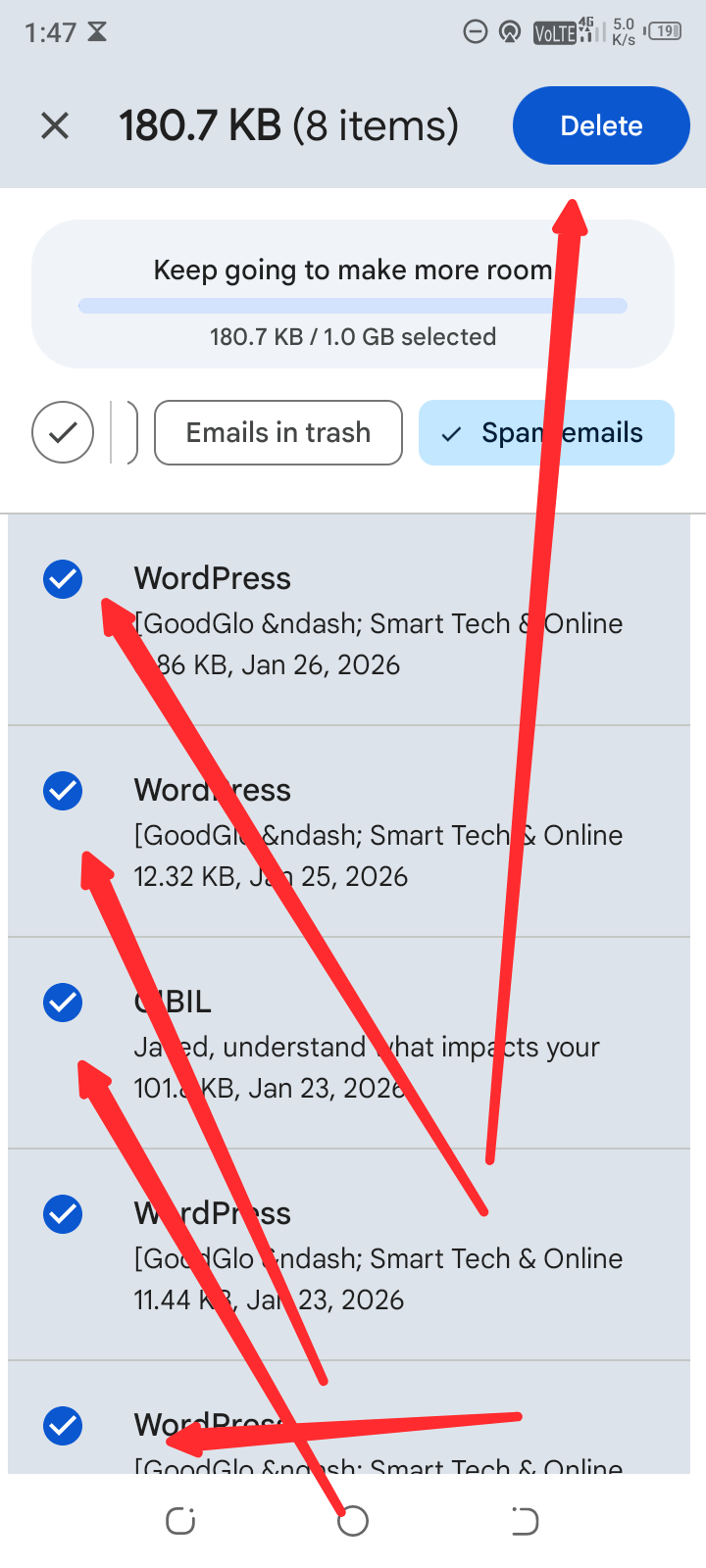 Spams email पर क्लिक करने के बाद बड़ी साइज की फाइलें सभी आपके यहां पर दिखाई देगी सभी को एक – एक करके सेलेक्ट करना है उसके बाद डिलीट का ऑप्शन देखने के लिए मिलेगा आप डिलीट पर क्लिक करके सभी को डिलीट कर दें।