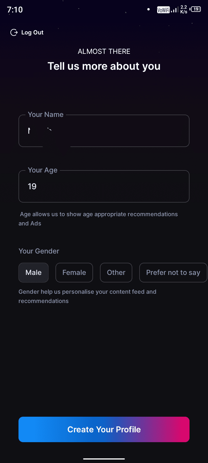 नाम दर्ज करने के बाद आपको अपनी आयु बतानी है तथा आपको अपना Gender Select करना है। उसके बाद Create Your Profile बटन पर Click कर दें, आपका यहां पर Jio Hotstar एप्लिकेशन में अकाउंट Create हो जाएगा।