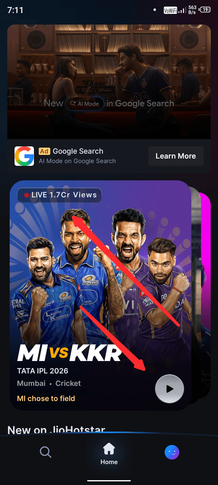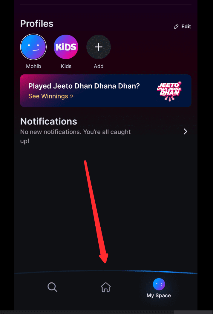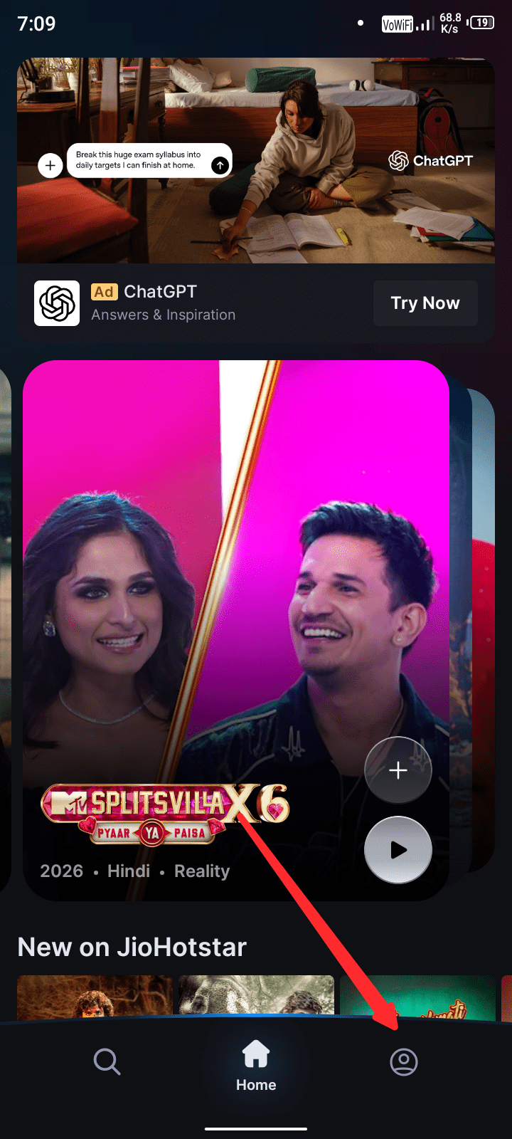 Jio Hotstar एप्लिकेशन में Location की Permission देने के बाद आपको Jio Hotstar एप्लिकेशन का Home Page दिखाई देगा। यहां पर आपको Profile पर Click करना है।