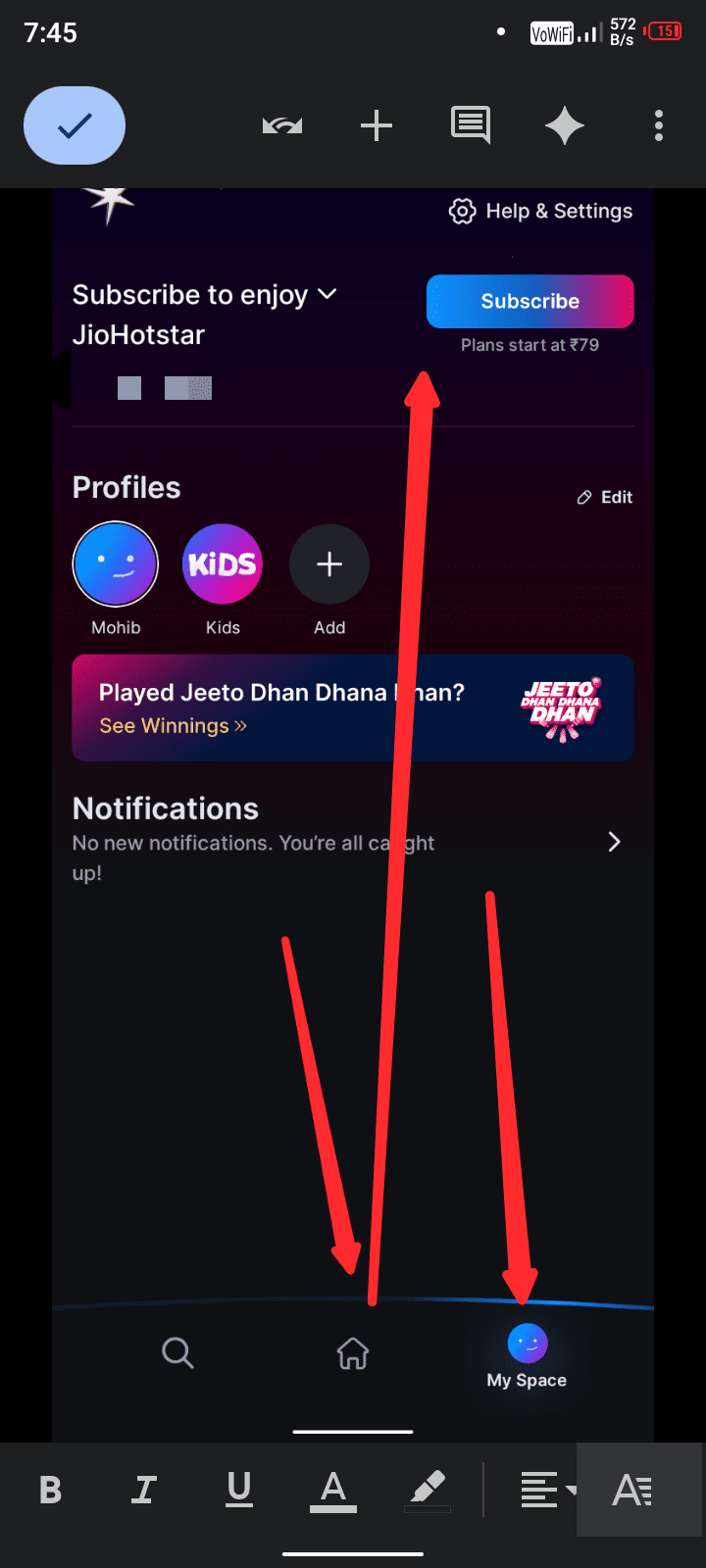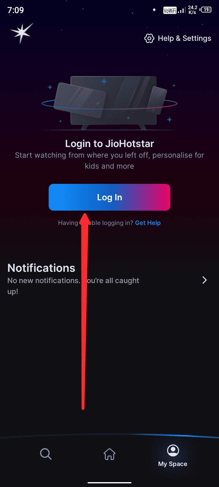 Jio Hotstar एप्लिकेशन का Subscription लेने के लिए सबसे पहले आपको Play Store एप्लिकेशन से अकाउंट Create कर लेना है। यहां इस आर्टिकल में बताए तरीके से अकाउंट Create करना है तथा My Space पर Click करना है।