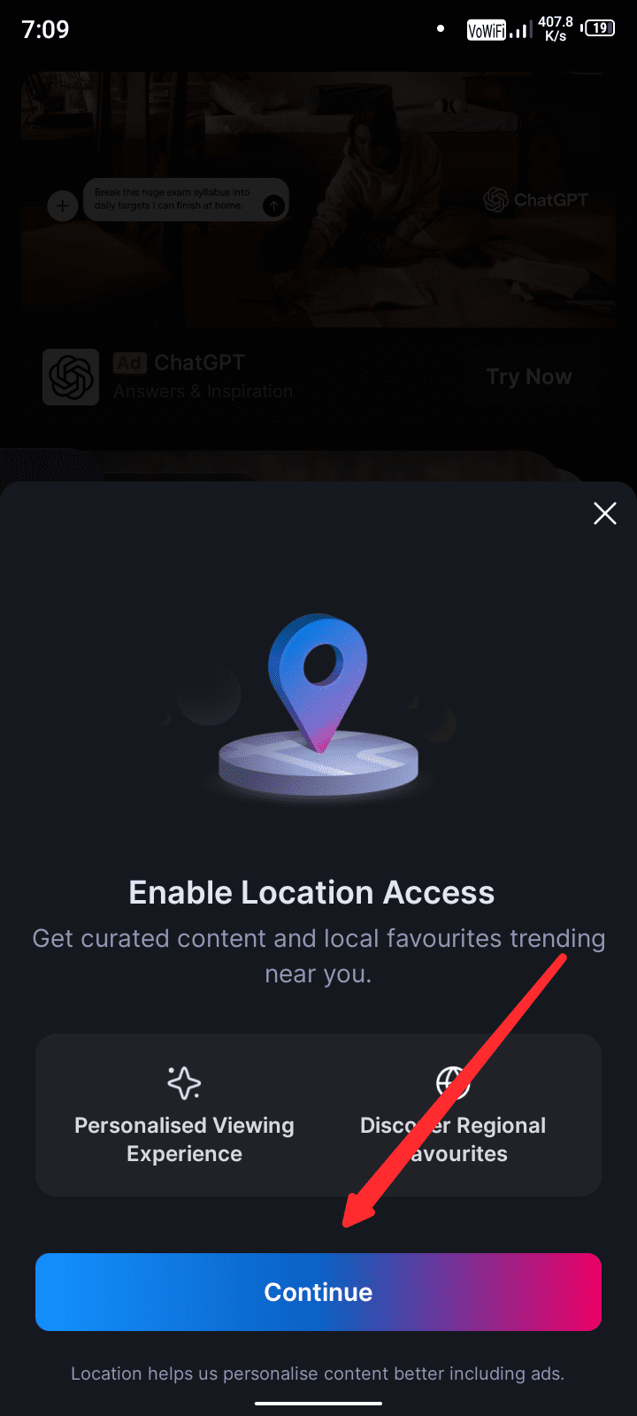 अब आप एप्लिकेशन के दूसरे पेज पर आ जाएंगे। यहां पर आने के बाद आपको Location की Permission देनी होगी। Location की Permission देने के लिए आप Continue पर Click करें, उसके बाद Permission दे दें।