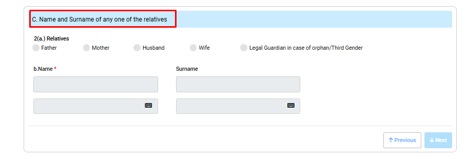 Name and Surname of any one of the relatives यहाँ पर आपको अपने माता पिता में से एक की जानकारी को दर्ज करना हैं पहले जिसका जानकारी आप देना चाहते हैं नाम सेलेक्ट करें उसका नाम लिखें Next कर दें,