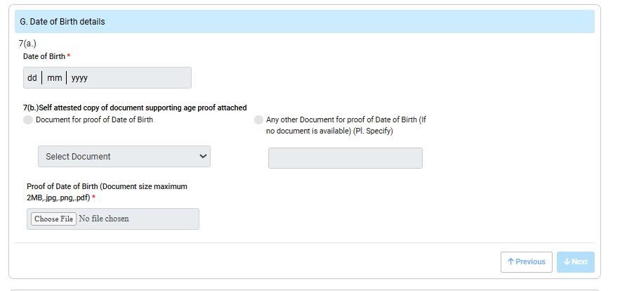Gender सेलेक्ट करने के बाद Date Of Birth Details भरनी हैं, सबसे पहले आप Date Of barth आधार कार्ड से देखकर जानकारी को भरें, उसके बाद Self attested copy of document supporting age proof attached ऑप्शन सेलेक्ट कर दें और दस्तावेज upload कर दें