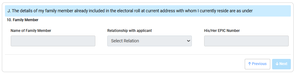 Family Member को सेलेक्ट करना हैं आपके परिवार में जिसका पहले से वोटर आईडी कार्ड बना हुआ है उसका नाम लिखना है उस व्यक्ति से आपका क्या रिलेशन है सेलेक्ट करना है और उसके वोटर आईडी कार्ड का एपिक नंबर लिखना है।