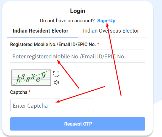 वोटर सर्विस पोर्टल पर आने के बाद पहले आपको अपना अकाउंट क्रिएट करना होगा यदि अकाउंट पहले से बना हुआ है तब Login करना है Login करने के लिए मोबाइल नंबर तथा कैप्चा कोड दर्ज करें और Request OTP पर क्लिक कर दें आपके दिए मोबाइल नंबर पर ओटीपी प्राप्त होगा दर्ज करें और सबमिट कर दें।