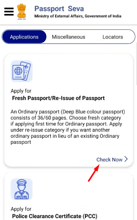- एप्लीकेशन से पासपोर्ट अप्लाई करने के लिए Check Now लिंक पर क्लिक करें।