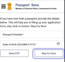 - यहां पर हमें नया पासपोर्ट अप्लाई करना है पहले से पासपोर्ट नहीं है तो हमें पासपोर्ट नंबर या डेट ऑफ बर्थ नहीं लिखनी है Skip For Now पर क्लिक करें।