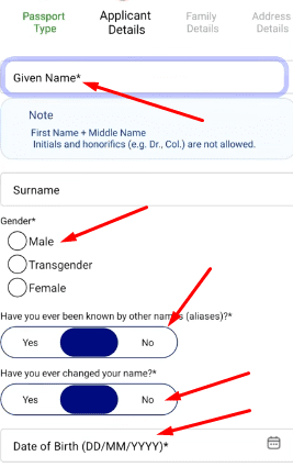 - Passport Type फील करने के बाद Applicant Details दर्ज करनी हैं यहाँ पर वही जानकारी दर्ज करें जो आप पासपोर्ट पर प्रिंट करना चाहते हैं,