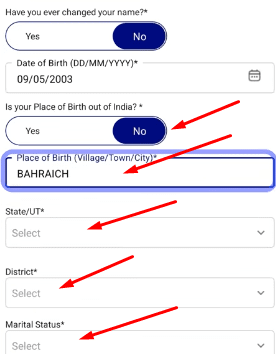 - जन्मतिथि दर्ज करने के बाद आपसे पूछा जाएगा क्या आपका जन्म भारत में हुआ है या दूसरे देश में हुआ है आपका जन्म भारत देश में हुआ है तो No ऑप्शन सेलेक्ट करें यदि भारत में नहीं हुआ दूसरे देश में जन्म हुआ है तब Yes पर क्लिक करें