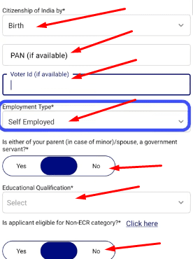 - बाकी के सभी ऑप्शन No सेलेक्ट करें और अपना qualification दर्ज करें।