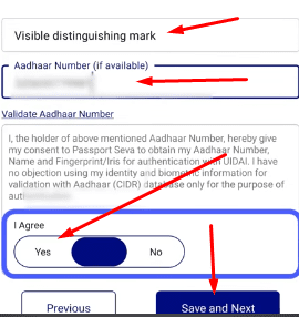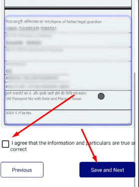अपने पासपोर्ट अप्लाई करने के लिए अभी जो जानकारी दर्ज की है सभी यहां पर दिखाई देगी पहले सभी जानकारी सही से चेक करें तथा I Agree पर क्लिक करके save and next पर क्लिककर दें