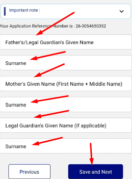 Save And Next पर क्लिक करने के बाद माता-पिता की जानकारी दर्ज करें जैसे की माता का नाम पिता का नाम अपने दस्तावेज से देख कर लिख दे और Save And Next पर क्लिक कर दें,