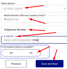 Police station सिलेक्ट कर लेने के बाद मोबाइल नंबर दर्ज करें टेलीफोन नंबर खाली छोड़ सकते हैं ईमेल आईडी लिखे तथा परमानेंट एड्रेस अवेलेबल No करके सेव एंड नेक्स्ट पर क्लिक कर दें।