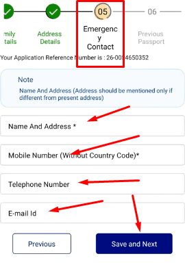 आपसे इमरजेंसी कांटेक्ट डिटेल्स मांगी जाएगी यहां पर आप अपने भाई माता या पिता की इमरजेंसी कांटेक्ट डिटेल्स दर्ज कर सकते हैं जैसे कि नाम तथा एड्रेस मोबाइल नंबर और ईमेल आईडी दर्ज करके Save And Next पर क्लिक कर दें