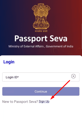 Apply for passport service पर क्लिक करने के बाद Login पेज पर आप आ जाएंगे यहां आने के बाद आपके अकाउंट क्रिएट करना है इसके लिए Sign Up लिंक पर क्लिक करें।