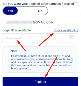 - ईमेल आईडी दर्ज करने के बाद check availability पर क्लिक करके देखें ईमेल आईडी पहले से इस्तेमाल की गई है या नहीं यदि ईमेल आईडी पहले से इस्तेमाल नहीं की गई है तब पासवर्ड लिखें