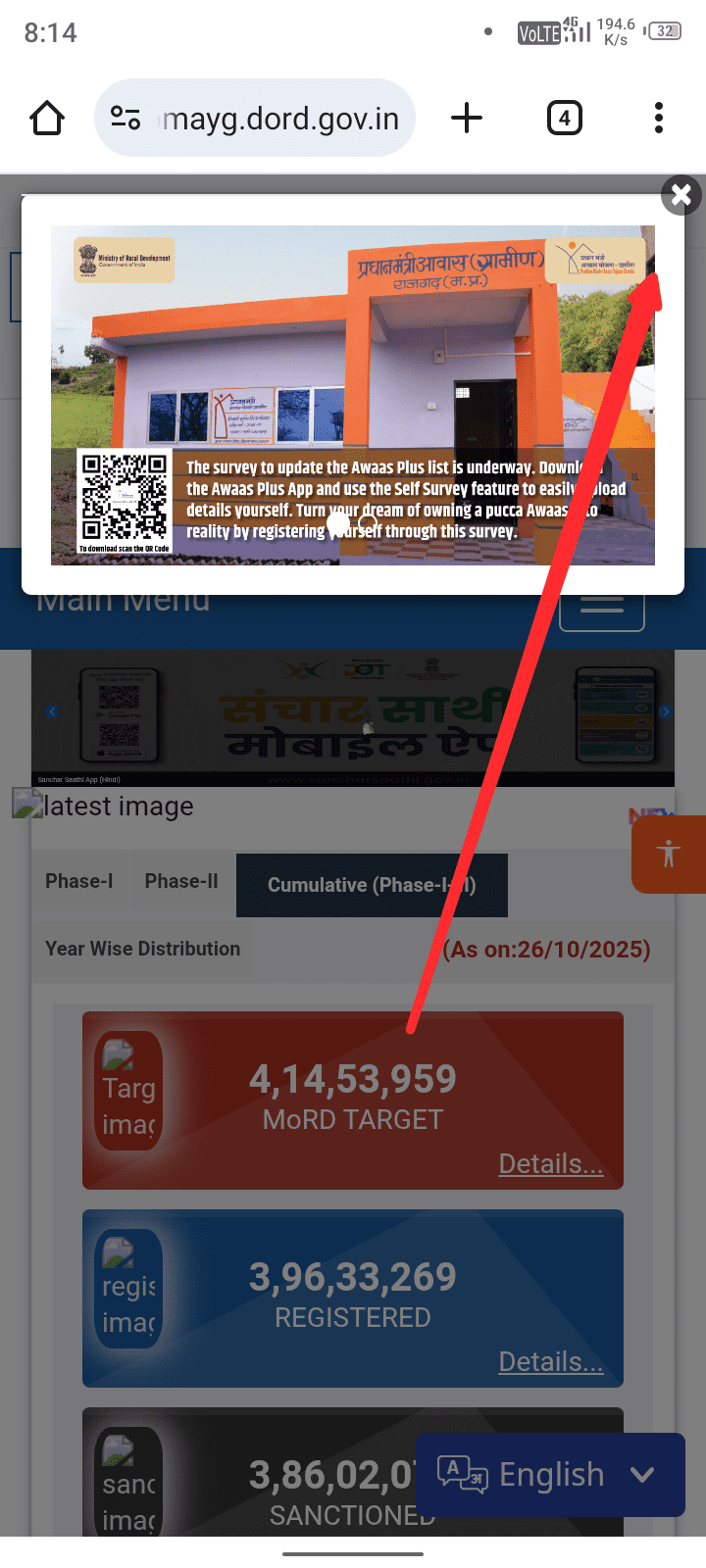 प्रधानमंत्री आवास योजना की लिस्ट चेक करने के लिए सबसे पहले आपको अपने मोबाइल में या कंप्यूटर में गूगल को ओपन करना है और pmayg.dord.gov.in इस वेबसाइट का नाम सर्च करना है दूसरे नंबर पर यह वेबसाइट आपको दिखाई देगी वेबसाइट पर क्लिक करके इस वेबसाइट पर आ जाना है या आप सीधे लिंक पर क्लिक करके यहां से भी वेबसाइट पर जा सकते हैं वेबसाइट जब ओपन होगी सबसे पहले आपको कुछ इस तरह से पॉप दिखाई देगा जो यहां आप ऊपर फोटो में देख रहे हैं इसको स्किप कर दें।