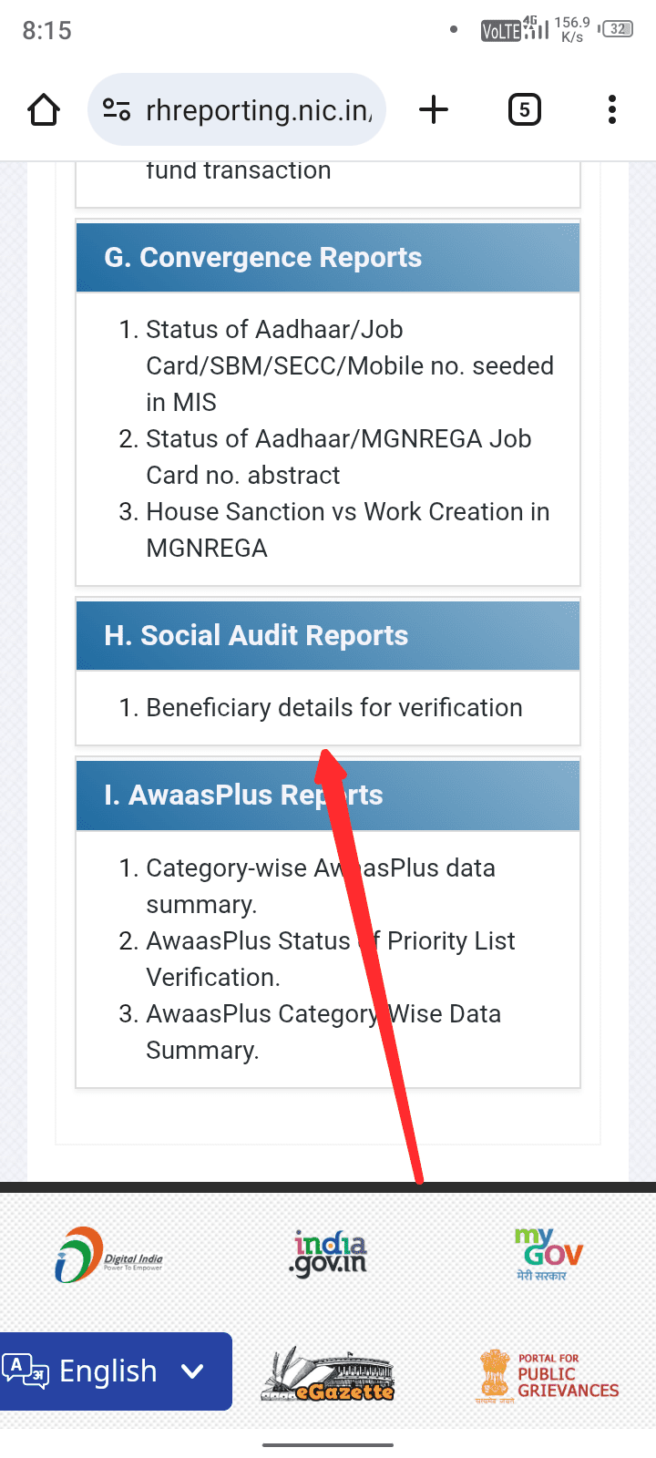 - Beneficiary details for verification पर क्लिक करें: H. Social Audit Reports में आकर Beneficiary details for verification पर क्लिक करें,