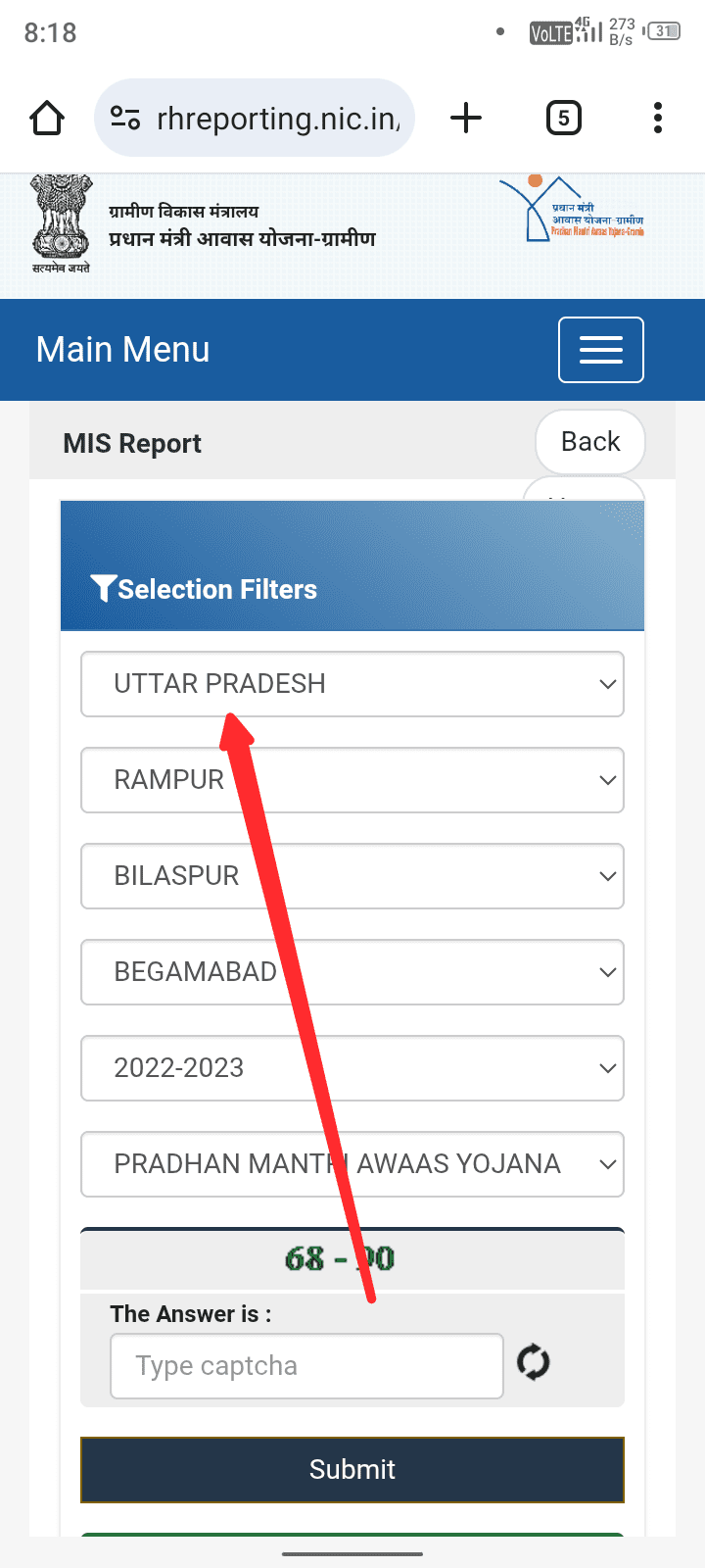 अब आपके सामने प्रधानमंत्री आवास योजना सूची चेक करने का Form खुलेगा यहां पर आपको अपनी जानकारी दर्ज करनी है, सबसे पहले आपको अपने राज्य को सेलेक्ट करना है, भारत के सभी राज्य के नाम यहां पर आपको देखने के लिए मिलेंगे आप जिस राज्य की सूची देखना चाहते हैं इस राज्य पर क्लिक करें मैं यहां पर उत्तर प्रदेश का चयन कर लिया है।