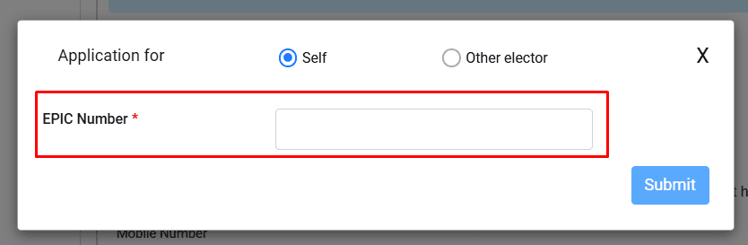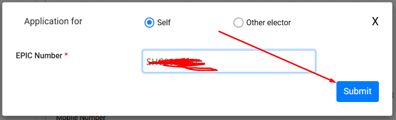 Self पर क्लिक करने के बाद एपिक नंबर लिखने के बाद Submit बटन एक्टिव हो जाएगा अब इसके ऊपर क्लिक कर देना हैं,