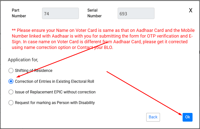 अब आप इस पेज पर आ जाएंगे यहाँ पर आने के बाद आपको पहले लाल कलर में जो टेक्स्ट लिखा है इसको पढ़ना है इनका कहने का मतलब है अगर आप खुद से वोटर आईडी कार्ड में मोबाइल नंबर लिंक करना चाहते है तो आपका वोटर आईडी कार्ड पर नाम और आधार कार्ड में नाम Same होना चाहिए। तभी आप कर सकते हैं, अगर Same है तो अब आपको Application For में ऑप्शन का चयन करना है, आप अपने मोबाइल नंबर को लिंक करना चाहते है तो आप Correction of Entries in existing electoral roll ऑप्शन को सेलेक्ट करना हैं, उसके बाद OK पर क्लिक करना हैं,