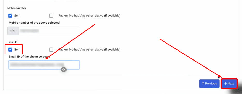 अब Mobile number के बॉक्स को पढ़ना है यहाँ पर आने के बाद आपको Self Box टिक करना हैं उसके बाद Mobile नंबर लिखना है जो आप लिंक करना चाहते हैं, फिर Next पर क्लिक कर देना हैं,