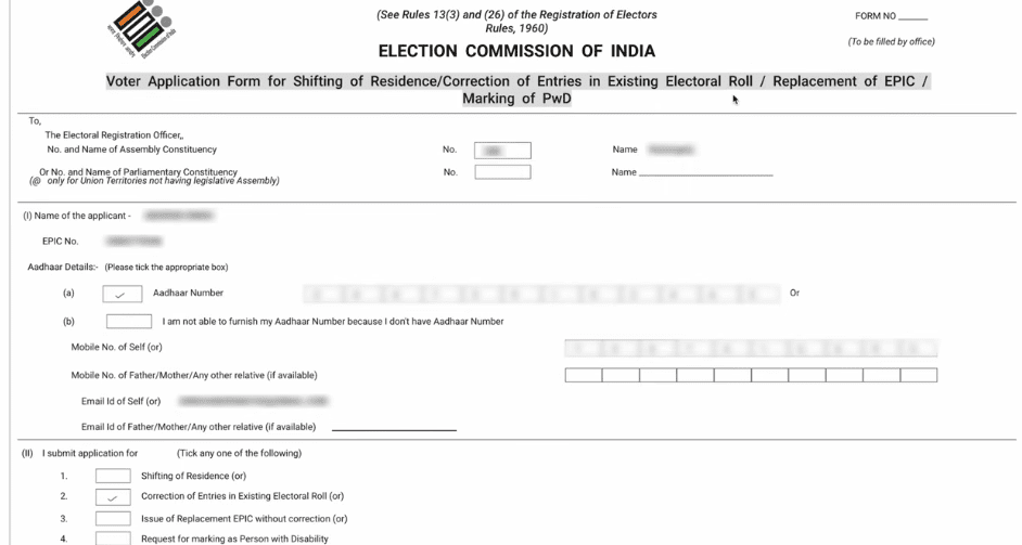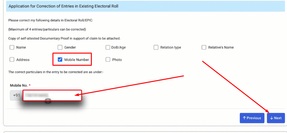 Next करने पर और नीचे आपको दूसरे ऑप्शन दिखाई देंगे अब आप Application for correction of entries in existing electoral roll पर आ जाएंगे यहाँ पर आने के बाद आपको Mobile Number Box को टिक करना है और मोबाइल नंबर लिखना हैं, तथा Next पर क्लिक कर देना हैं,