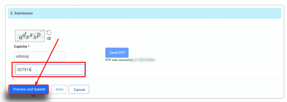 Send OTP पर क्लिक करने के बाद आपको जो मोबाइल नंबर लिखा था उसपर OTP आएगा उसे दर्ज कर दें,और Preview and submit पर क्लिक कर दें,