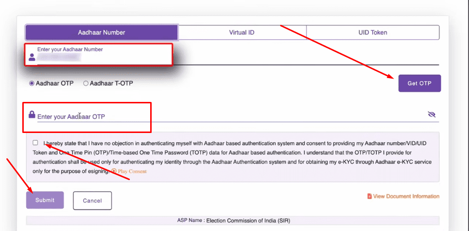 - OTP से verify कर दें उसके बाद आधार कार्ड नंबर को लिखे