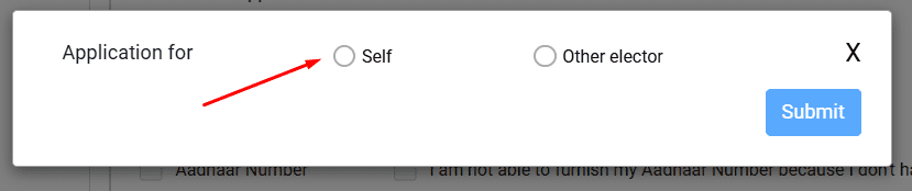 Form 8 पर क्लिक करने के बाद आपको यह पॉपअप दिखाई देगा आपको यहाँ पर आने के बाद Self ऑप्शन पर क्लिक करना हैं, यदि आप किसी दूसरे व्यक्ति का मोबाइल नंबर लिंक करना चाहते है तो आपको Other elector पर क्लिक करना हैं यहाँ हम अपना मोबाइल नंबर लिंक कर रहे हैं तो सेल्फ पर क्लिक करेंगे,