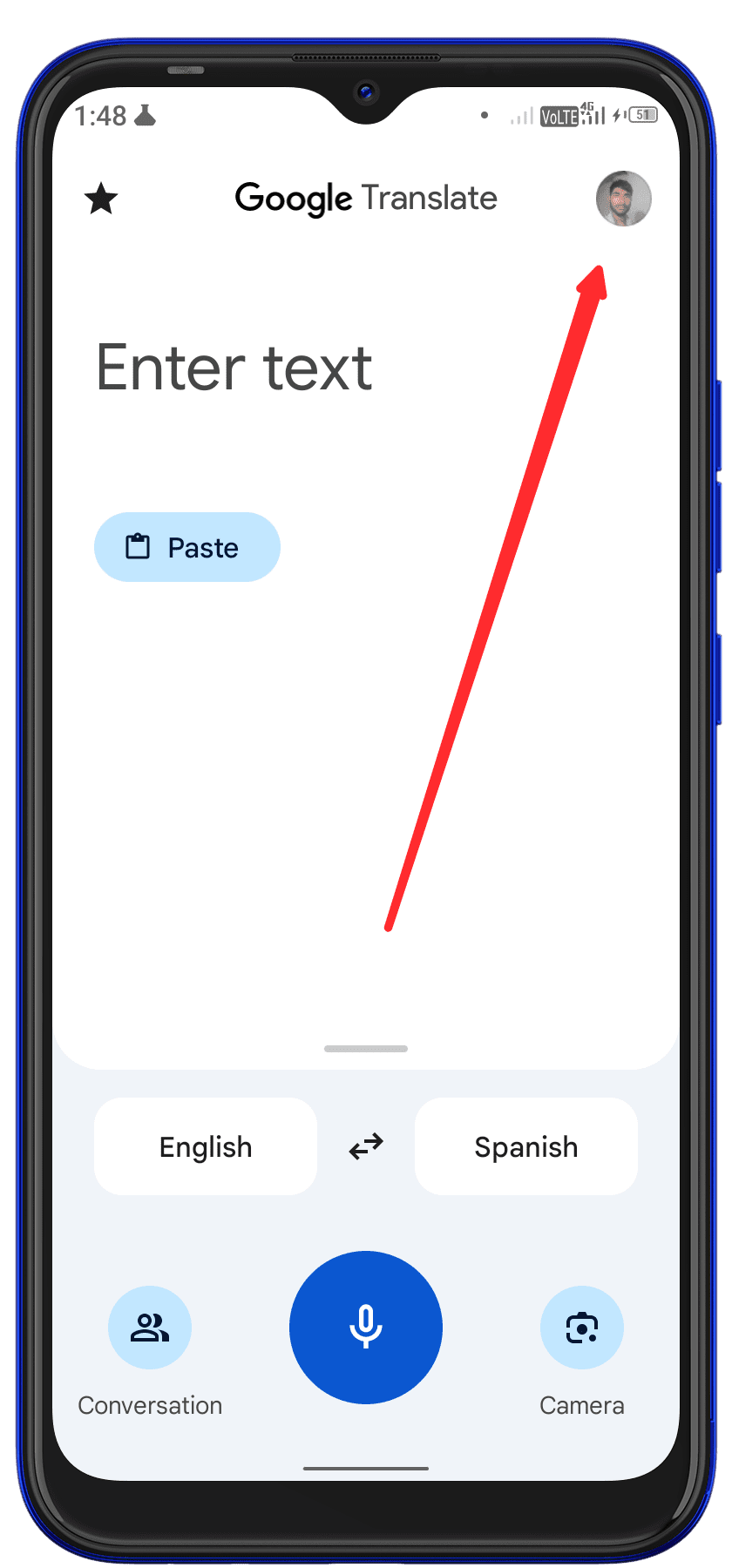 - ट्रांसलेट एप्लीकेशन ओपन होने के बाद इसका पहला होम पेज आपको इस तरह से देखने के लिए मिलेगा जैसा आप यहां ऊपर फोटो में देख रहे हैं यहां पर आने के बाद आपको प्रोफाइल आइकन पर क्लिक करना है।