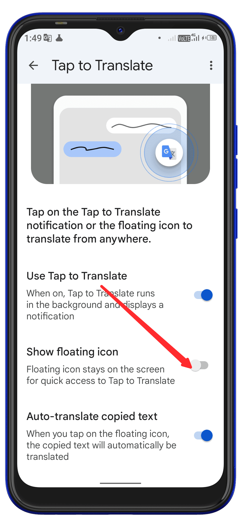 - Use tap to translate setting enable करने के बाद आपको नीचे एक और सेटिंग मिलेगी इसको भी आपको इनेबल करना है इनेबल करने के लिए Show Floating icon के बटन पर क्लिक करना है इसके बाद यह सेटिंग Enable हो जाएगी।