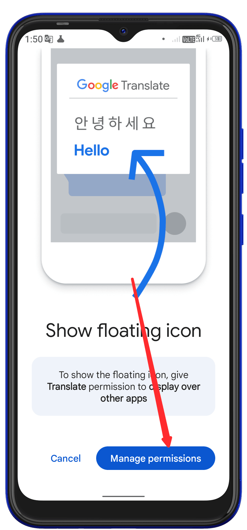- Show Floating icon की सेटिंग इनेबल करने के लिए आप बटन पर क्लिक करेंगे उसके बाद आपके सामने अगला पेज खुलेगा Next Page में आपके यहां दो ऑप्शन मिलेंगे यहां आपको परमिशन Cancel भी कर सकते हैं या परमिशन दे भी सकते हैं आपको manage permission पर क्लिक करना है।